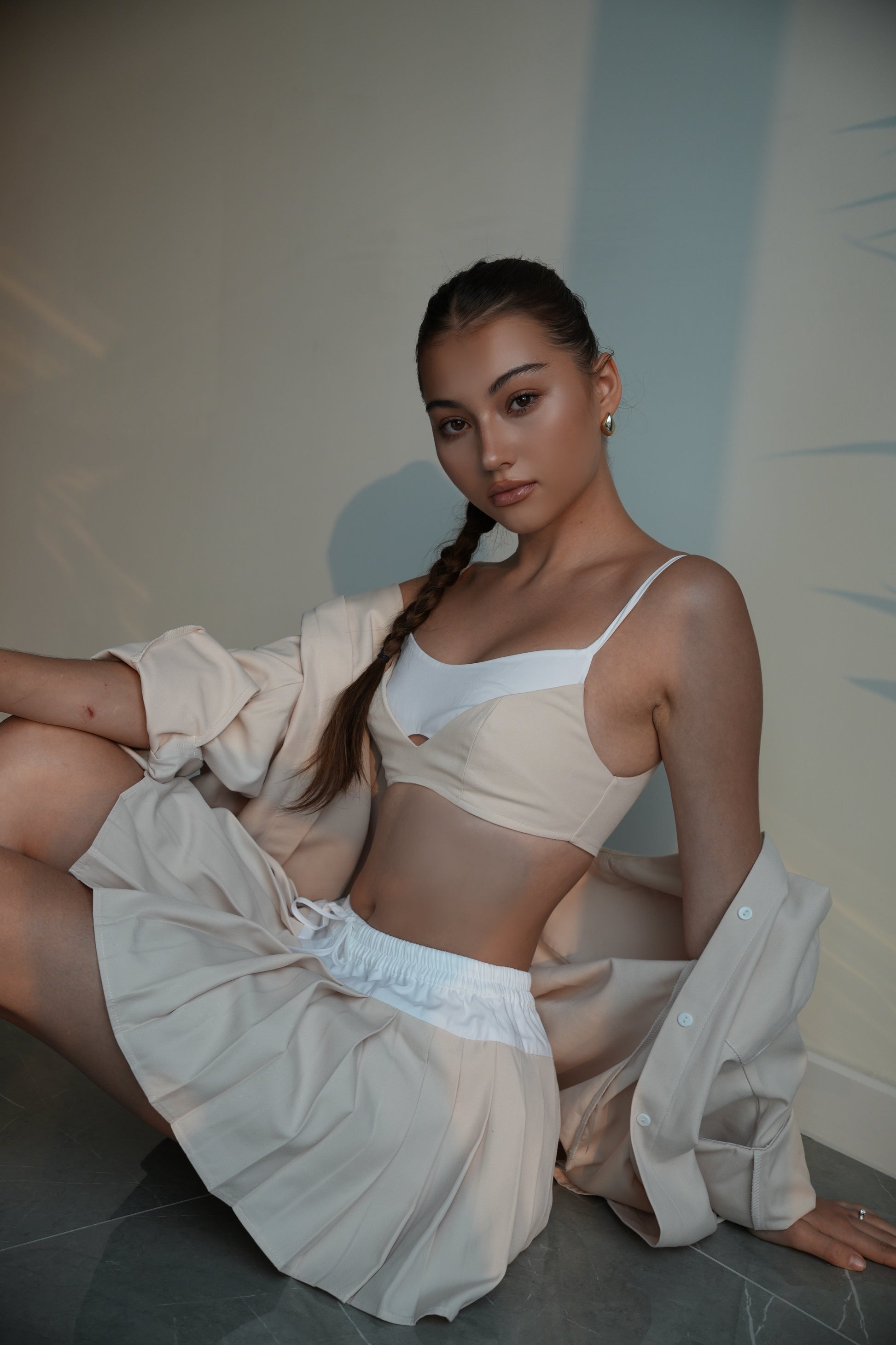 - Áo sơ mi form rộng hiện đại, dễ phối đồ, kết hợp áo croptop trẻ trung, năng động. Chân váy xếp ly tôn dáng, tinh tế, gam màu nhẹ nhàng hợp mọi tone da và phụ kiện